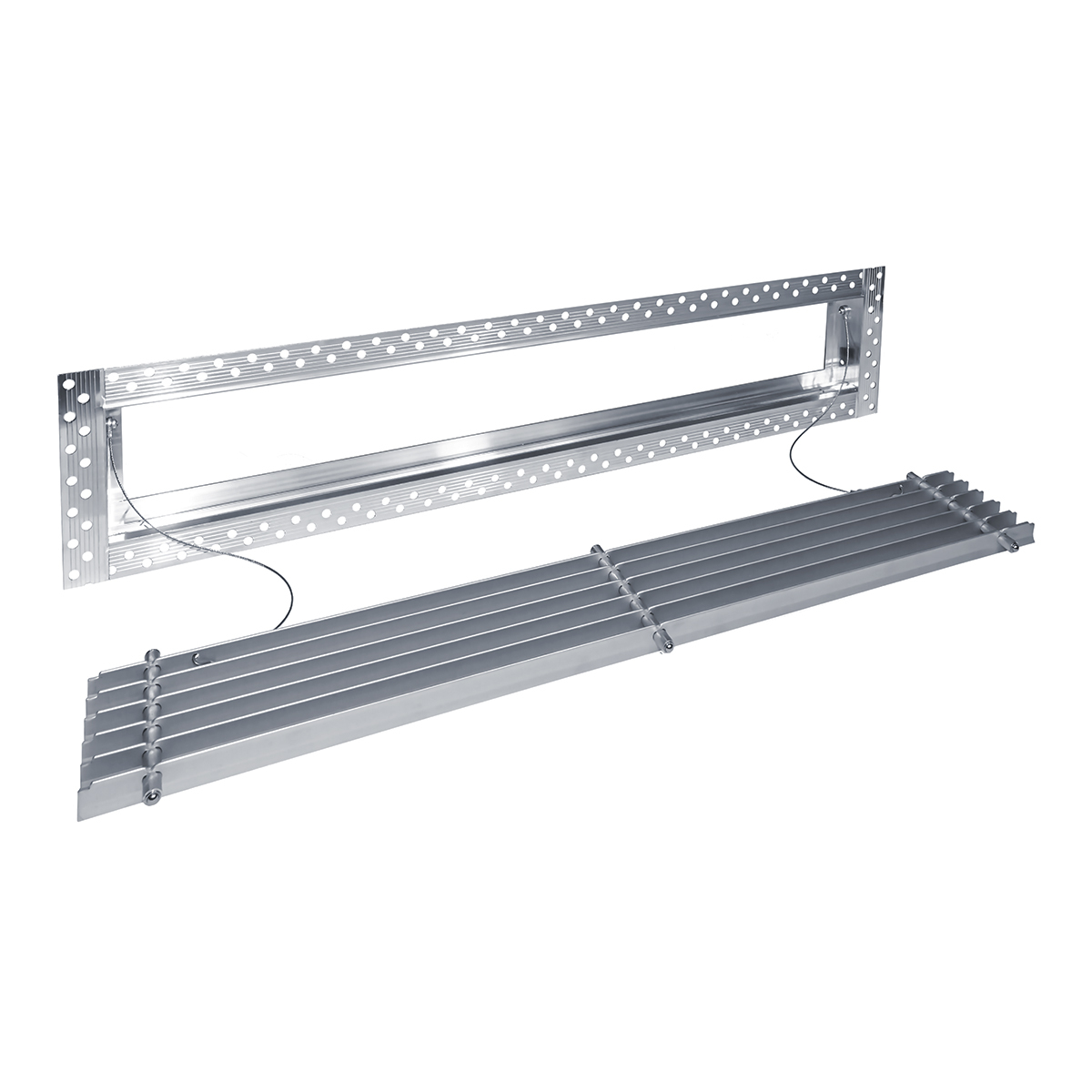 Данная решетка подходит для монтажа на любую поверхность под финишную отделку. Рамка и экран изготовлены из алюминия, опора экрана - из оцинкованной стали. Рама оснащена «полкой» 1,9 мм и рифлеными краями для большей адгезии финишного материала – шпатлевки, цемента. Решетка имеет съемную центральную часть с фиксированным углом наклона ламелей 0°. Она крепится к корпусу прочными металлическими тросиками, легко снимается для очистки и удобного обслуживания.